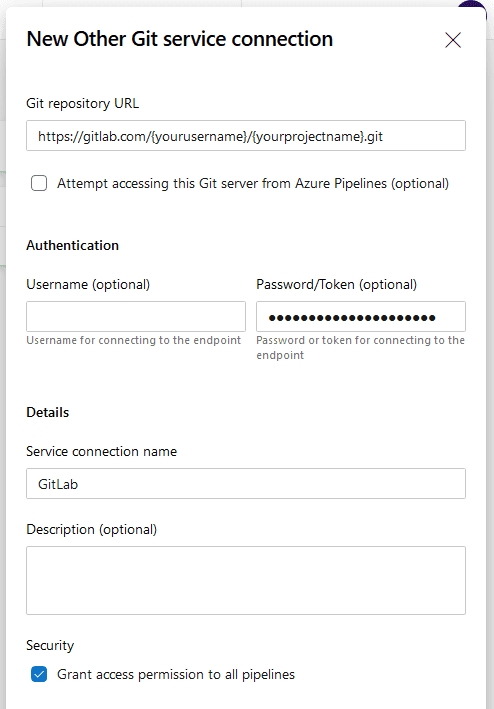 Enter the URL to your GitLab repository. In the Authentication section paste the access token you saved from earlier into the Password/Token field. The username isn't required.