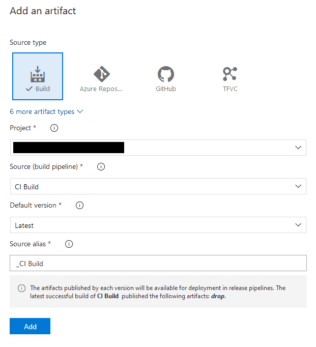 Your project should be pre-selected. Choose the build pipeline we've just created and feel free to change the source alias.