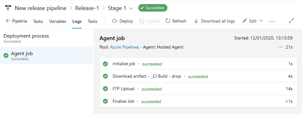To view logs of the full process, click on the Succeeded link in the Stage 1 box.