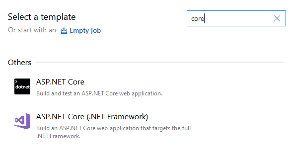 Next, we need to select the template for the pipeline. As I'm working with a .NET Core web app I'm selecting the ASP.NET Core template. Hover over your chosen template and then click the Apply button.
