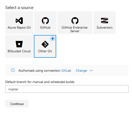 On the following screen the default options should be correct. The source should be Other Git and DevOps should have picked up your previously created GitLab connection. Ensure the correct branch name and click Continue.