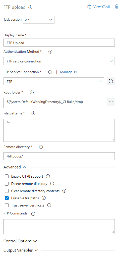 - Select the FTP service connection created earlier in the FTP Server Connection drop down.