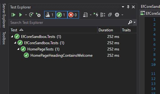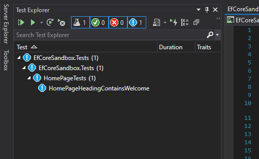 Let make the test fail. In the web application project change the content of the <h1> element. I've opted for "EF Core Sandbox". If you've got your UI tests project configured to be able to run against the local web application you can run the UI tests locally to confirm that they fail.