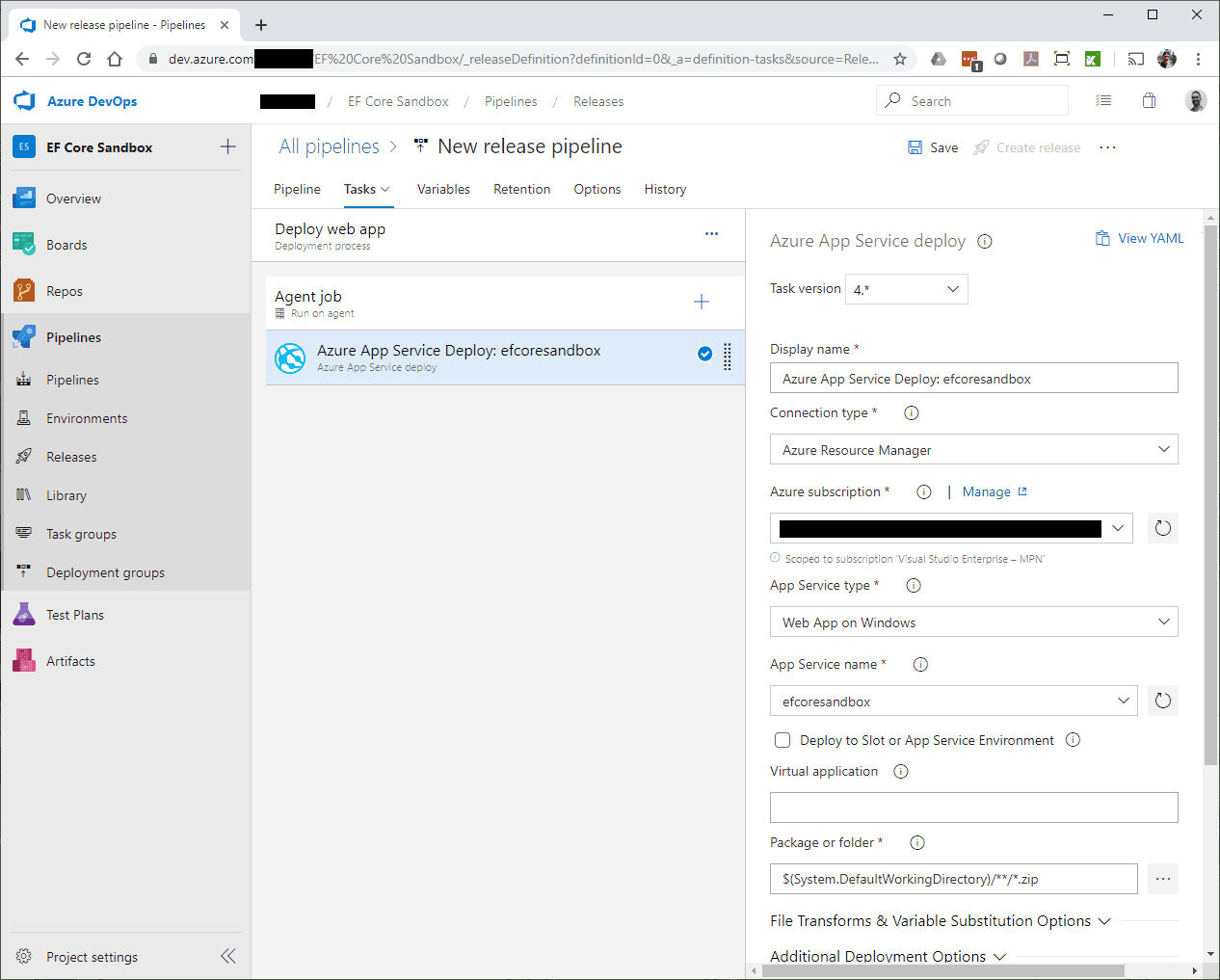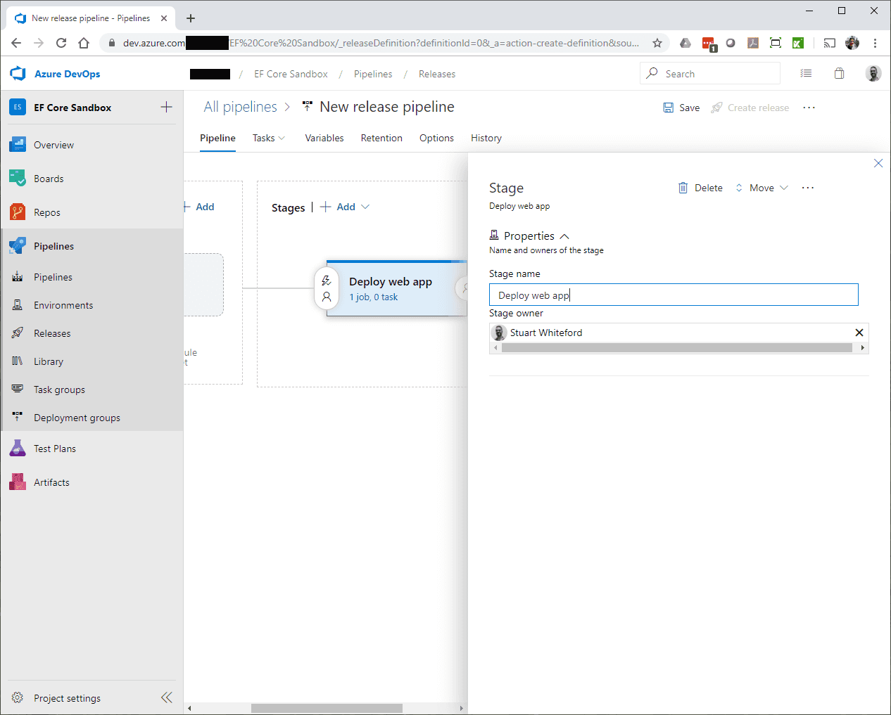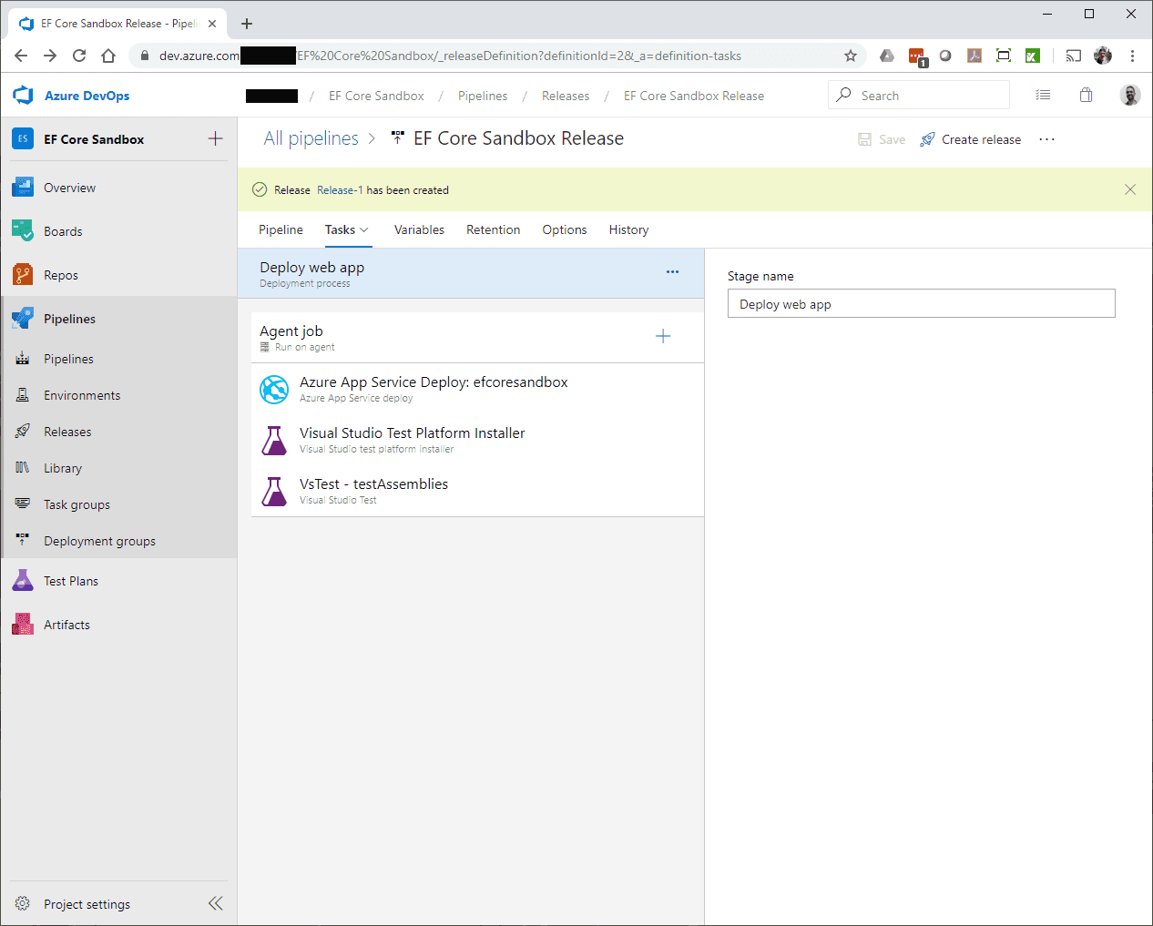 Give the release pipeline a name (I've chosen EF Core Sandbox Release) and save it.