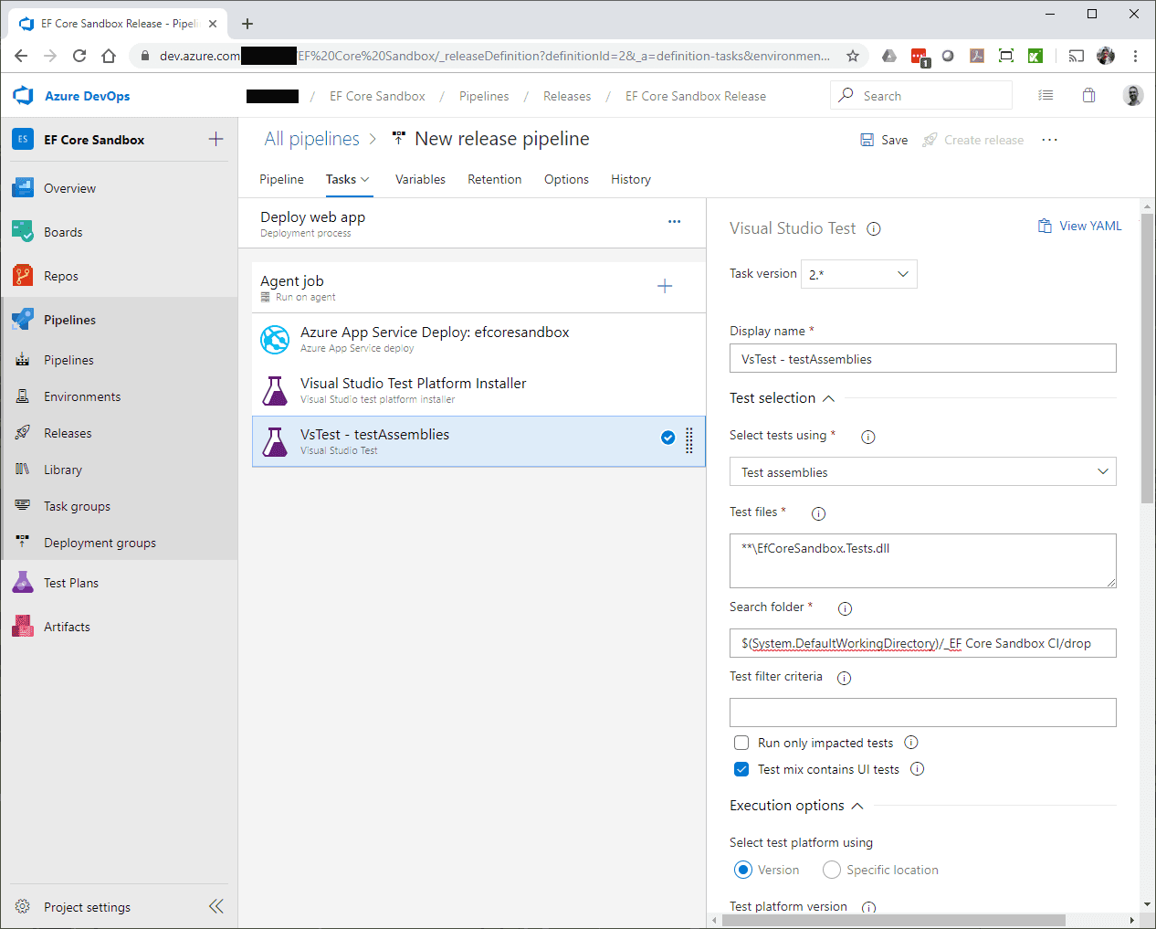 Click the + (plus) button again and the last task to add is a "Visual Studio Test" task. For the Test files field I've specifically chosen the EfCoreSandbox.Tests.dll to run and I've specified that the Text mix contains UI tests. For the Search folder I need to be more specific with the location – changing it to $(System.DefaultWorkingDirectory)/_EF Core Sandbox CI/drop
