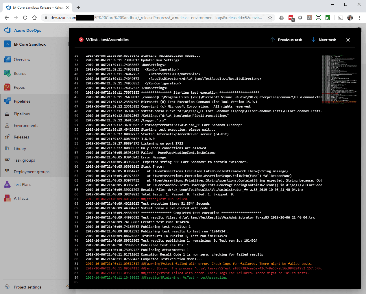 As youd expect we can see that the test failed with the message: Expected string "EF Core Sandbox" to contain "Welcome".