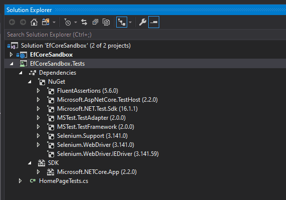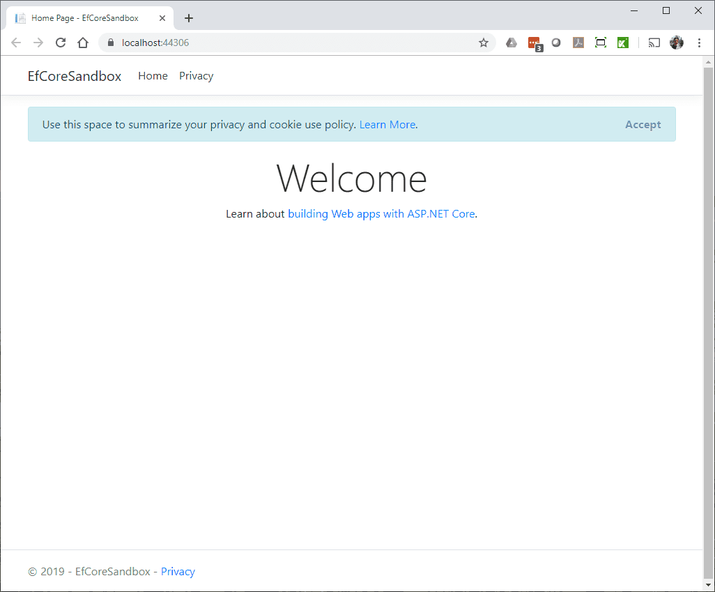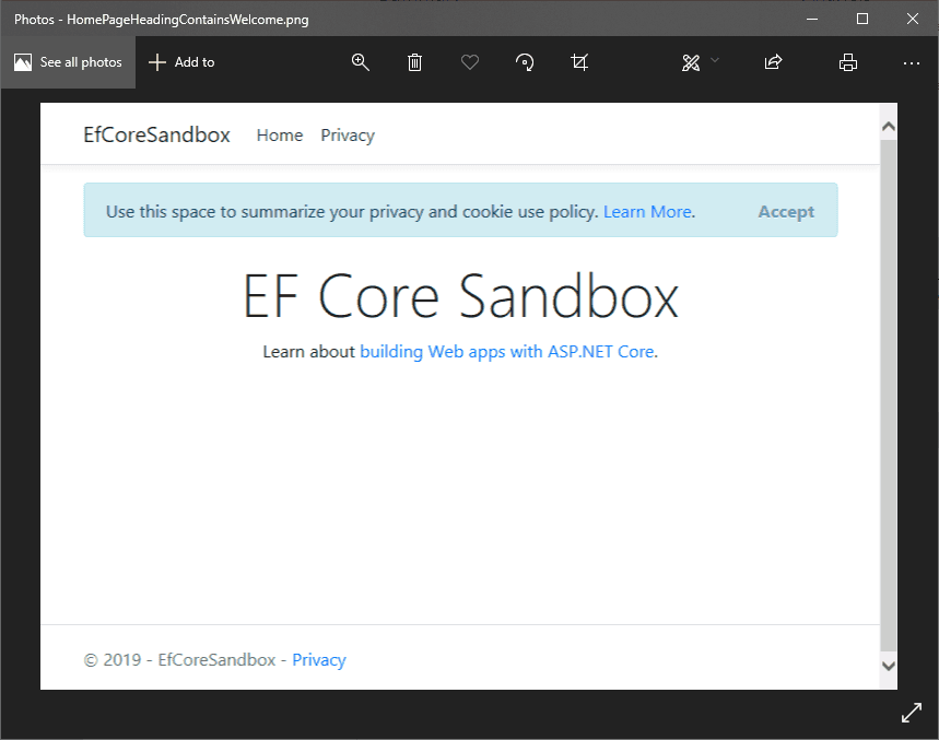 - A web site to test. I've got a pretty bare-bones ASP.NET Core web application (just using the Visual Studio 2019 template) that I've been playing around with recent versions of Entity Framework Core in. I'll write the tests against the home page of that site.