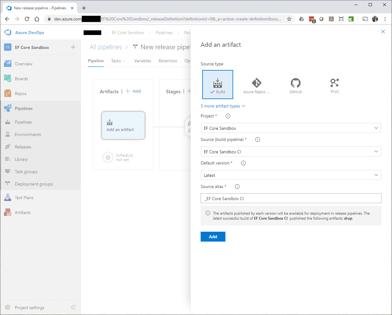 In the Artifacts panel click + Add. Choose Build as the source type and then select the appropriate project and build pipeline previously configured. Click the Add button.
