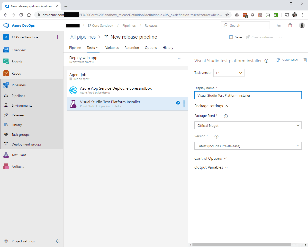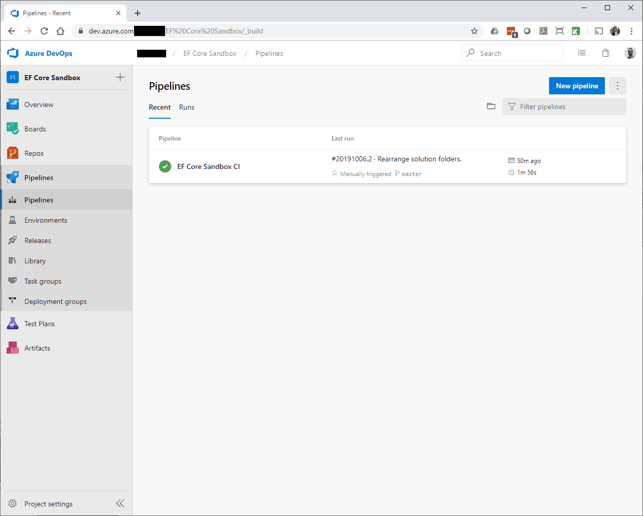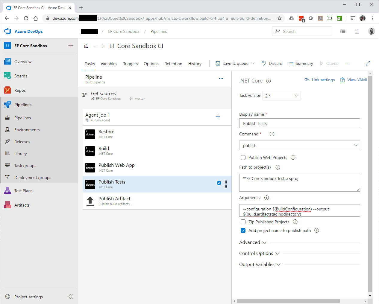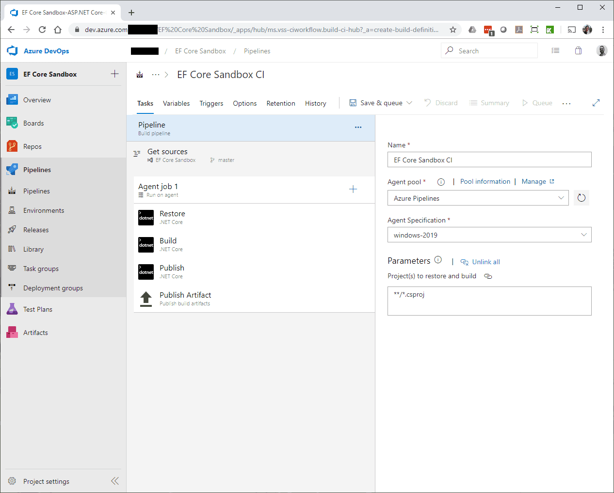 At the pipeline level I've renamed the pipeline to EF Core Sandbox CI and changes the Agent Specification to windows-2019. Also, given we have no unit tests, I've cleared the Project(s) to test field and removed the Test step in the pipeline. The pipeline should look like this for the moment.