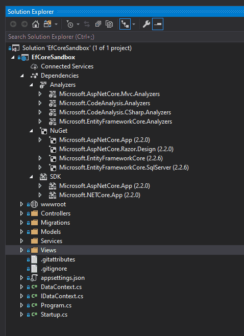 As stated, I'm using the template ASP.NET Core web application in Visual Studio 2019. Heres the project structure. I've added some data context related stuff but you dont need any of that for the purpose of these tests.