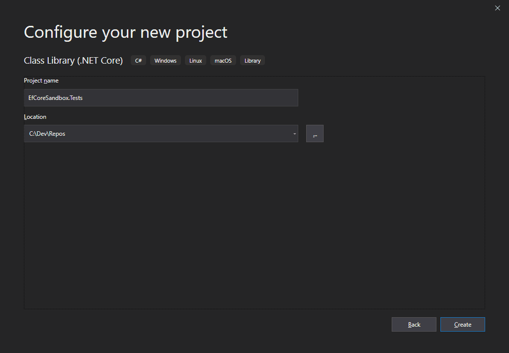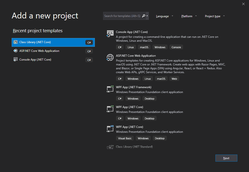 In the first dialogue select Class Library (.NET Core) then click Next.