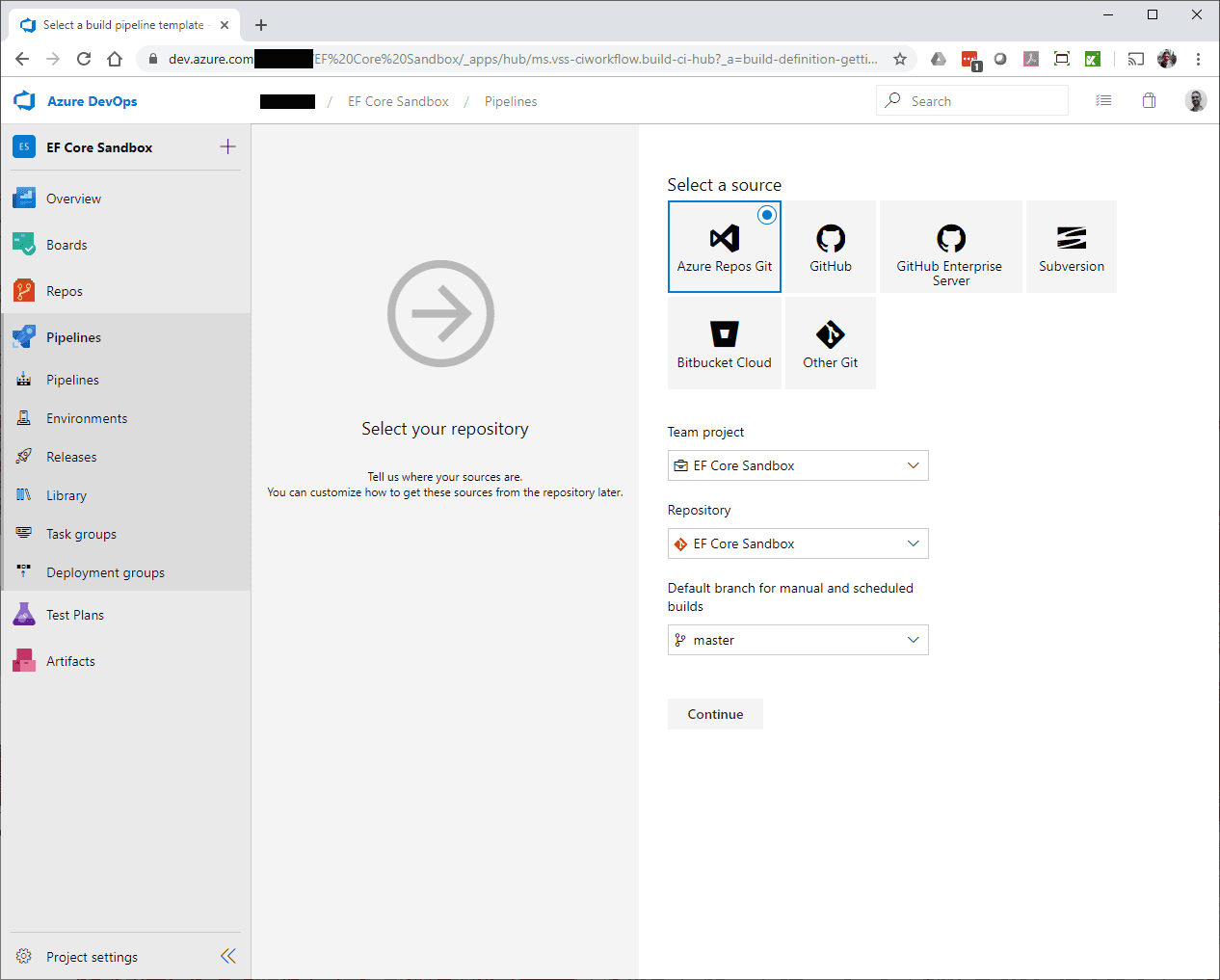 Choose the correct settings for your source repository, for me this is an Azure Repos Git repository. Team project and Repository are both EF Core Sandbox and I'm basing it on the master branch.