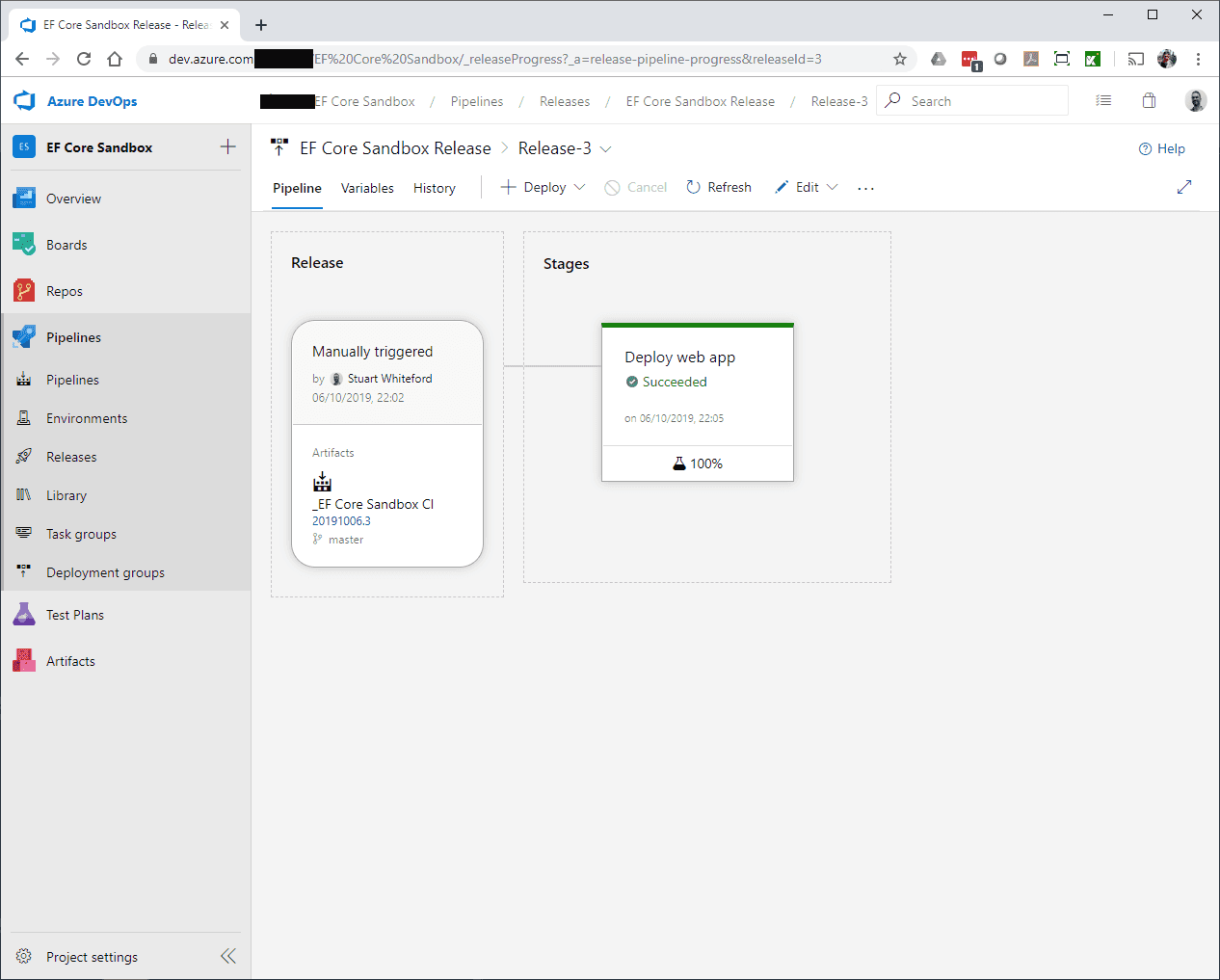 Click on the Release-1 link that appears at the top of the screen. Mine is Release-3 because I've been mucking about with the pipelines, generally getting things wrong, and have created a few more test releases.