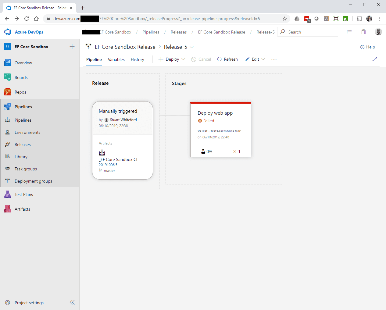 Go ahead and push the changes into source control then kick off a new build – unless your build pipeline is already CI triggered. Once the build has run (and succeeded) create a new release. Once the release run has completed you should see something slightly different, if not unexpected.