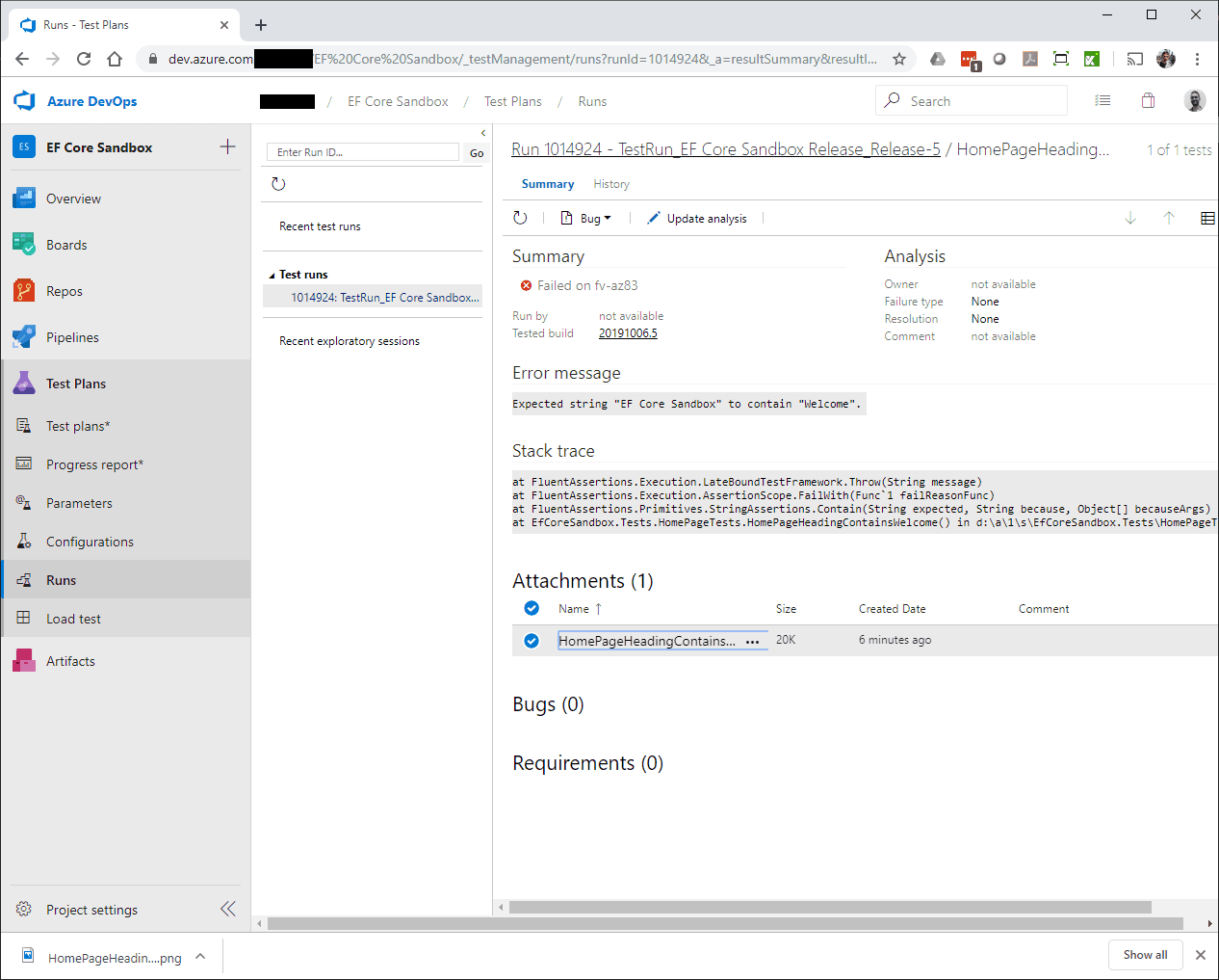 Double-click (yep, I know) on the latest run with the warning icon to see the run summary. From there click the Test results link just above the toolbar and under the Run number. This will list all the tests that have failed. Since we only have one double-click the HomePageHeadingContainsWelcome test. Here youll get the error message and stack trace for the failed test along with, about halfway down the page, an Attachments section that should have one file.